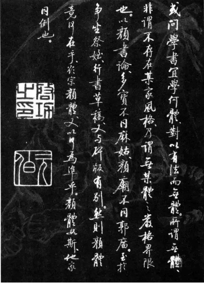 或问学书宜学何体,对以有法而无体。所谓无体,非谓不存在某家风格,乃谓无某体之严格界限也。以颜书论,多宝不同麻姑,颜庙不同郭庙,至于争座、祭侄,行文草稿,又与碑版有别。然则颜体竟何在乎?欲宗颜体,又以何为准乎?颜体如斯,他家同例也。