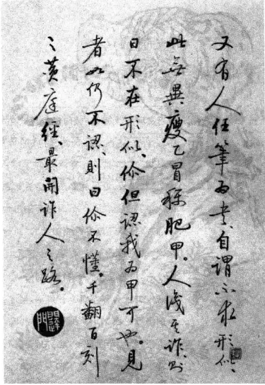 又有人任笔为书,自谓不求形似,此无异瘦乙冒称肥甲。人识其诈,则曰不在形似,你但认我为甲可也。见者如仍不不认,则曰你不懂。千翻百刻之《黄庭经》,最开诈人之路。