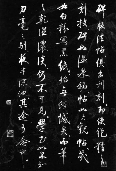 碑版法帖,俱出刊刻。即使绝精之刻技,碑如《温泉铭》,帖如《大观帖》,几如白粉写黑字,殆无余憾矣。而笔之干湿浓淡,仍不可见。学书如不知刀毫之别,夜半深池,其途可念也。
