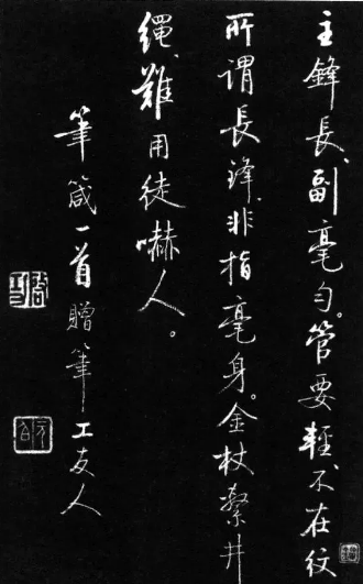 主锋长,副毫匀。管要轻,不在纹。所谓长锋,非指毫身。金杖系井绳,难用徒吓人。