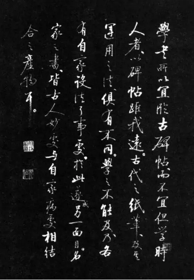 运笔要看墨迹,结字要看碑志。不见运笔之结字,无从知其来去呼应之致。结字不严之运笔,则见笔而不见字。无恰当位置之笔,自觉其龙飞凤舞,人见其杂乱无章。