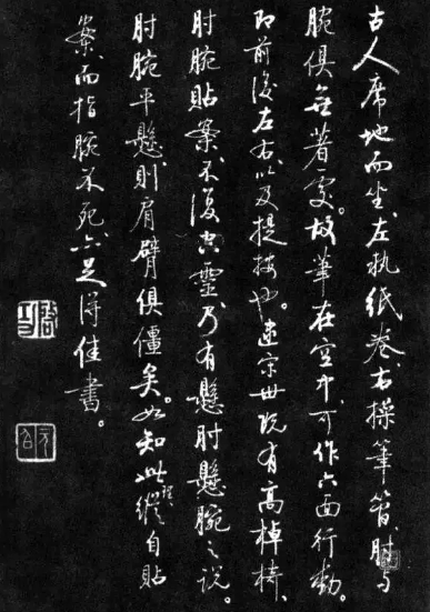 古人席地而坐,左执纸卷,右操笔管,肘与腕俱无着处。故笔在空中,可作六面行动,即前后左右,以及提按也。逮宋时既有高桌椅,肘腕贴案,不复空灵,乃有悬肘悬腕之说。肘腕平悬,则肩臂俱僵矣。如知此理,纵自贴案,而指腕不死,亦足得佳书。