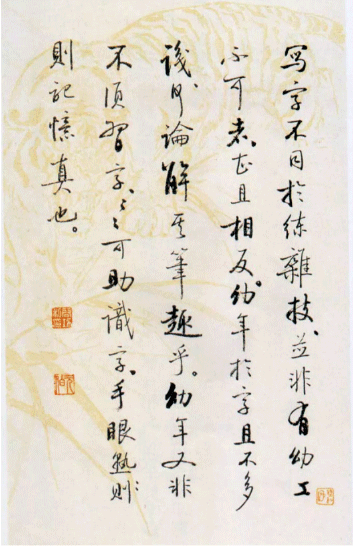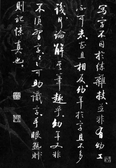 写字不同于练杂技,并非有幼工不可者,甚且相反。幼年于字且不多识,何论解其笔趣乎?幼年又非不须习字,习字可助识字,手眼熟则记忆真也。