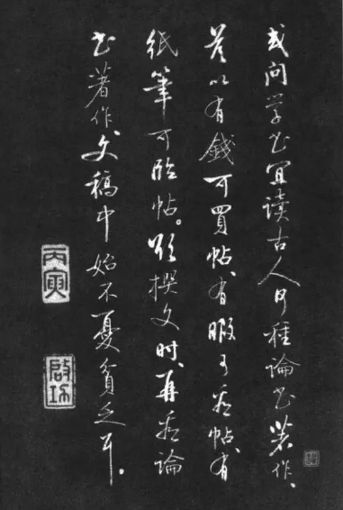 或问学书宜读古人何种论书著作,答以有钱可买帖,有暇可看帖,有纸笔可临帖。欲撰文时,再看论书著作,文稿中始不忧贫乏耳。