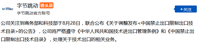 8月30日,字节跳动发布声明:公司关注到商务部和科技部于8月28日联合公布的《关于调整发布<中国禁止出口限制出口技术目录>的公告》,公司将严格遵守《中华人民共和国技术进出口管理条例》和《中国禁止出口限制出口技术目录》,处理关于技术出口的相关业务。