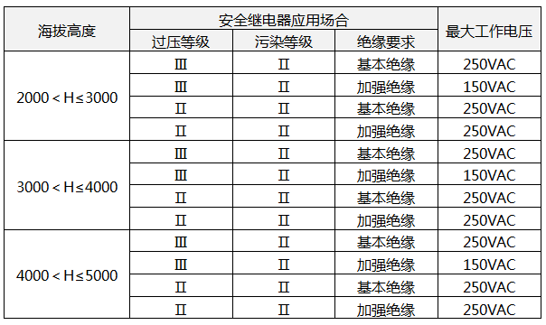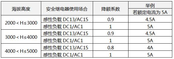 现针对可能有客户将安全继电器应用到不同海拔高度的环境,安全继电器说明书上所提供的技术参数适用于海拔高度最高2000m的操作高度应用,若需要将安全继电器应用在海拔高度大于2000m且小于等于5000m的环境下,则建议应降额使用。