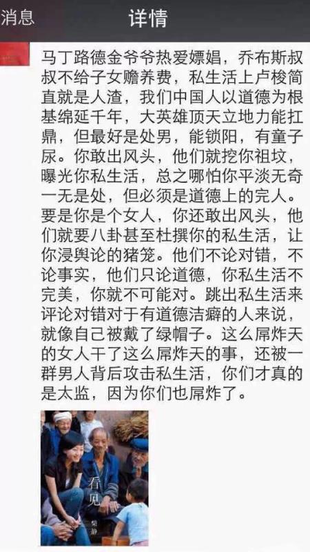 今天上午开始,朋友圈里的风突然开始转向,柴静的私生活被扒出来。高龄产妇、抽烟、开大排量车,美国等等关键词充斥。这么用心做的纪录片,很多评论却是集中在对柴静私生活和片子瑕疵的议论上,而不是对雾霾的讨论上。那些说片子没有触及深层原因的,现在正是你们站出来写长篇深度探讨文章的时候。那些说片子论据有谬的,现在是拿出科学证据让公众知情的时候。一个席卷全国的热点事件,让严肃的环保讨论得到了前所未有的高关注度,这样千载难逢的机会,可以搭顺风车做多少有意义的事情啊,而你却在扒人家的私生活?