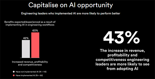 根据这项研究,与尚未实施AI的企业相比,已经实施AI的工程团队获得收入、盈利能力和竞争力增长的可能性要高出43%。