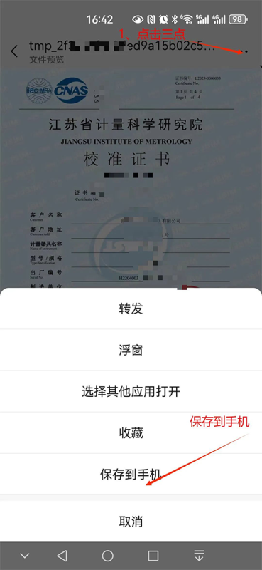 4、点击右上角,保存到手机完成证书下载