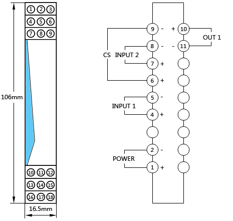 两路输入信号均为4-20mA,信号输出控制方式为开关量控制,输出一路4-20mA信号