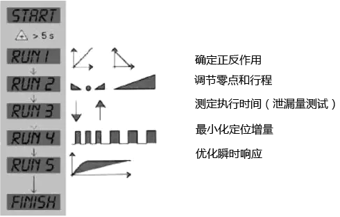 SIPART PS2阀门定位器初始化过程中的五步具体含义,见以上示例。在此期间无须任何操作。如果在某一步出现故障,则按照第三部分中的方案进行处理。
