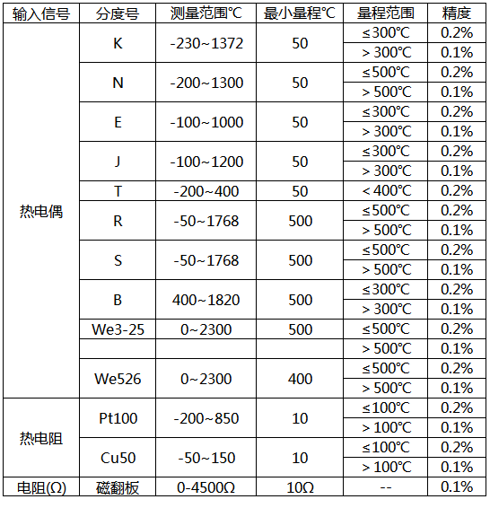 ◆智能隔离型温度变送器YR-ER212输入类型及精度