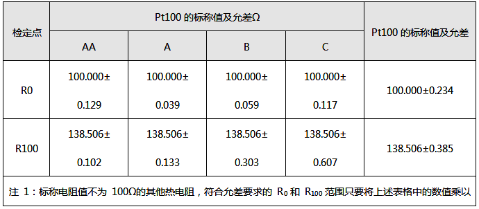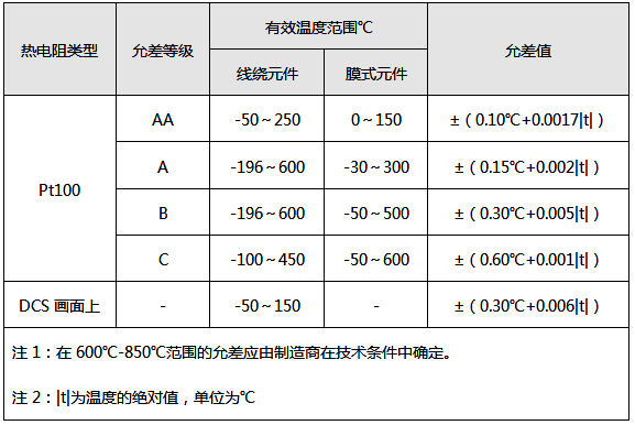 ①在有效温度范围内,Pt100的电阻值通过分度表查算出的温度t与真实温度的最大偏差,应不超过上表给定的允差值。