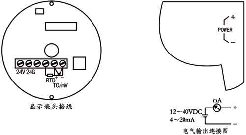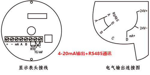 ②二线制4-20mA输出或者二线制4-20mA输出+HART通讯接线图