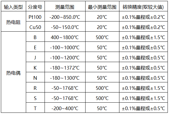 输入信号:热电阻(2种)和热电偶(10种)可设置
