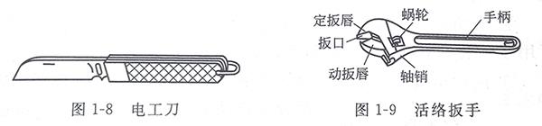电工刀是用来剖削或切割电工器材的常用工具,其外形如图1-8所示。电工刀有普通形和多用形两种。多用形电工刀除具有刀片外,还有折叠式的锯片、锥针和螺丝刀,可锯削电线槽板和锥钻木螺钉的低孔等。