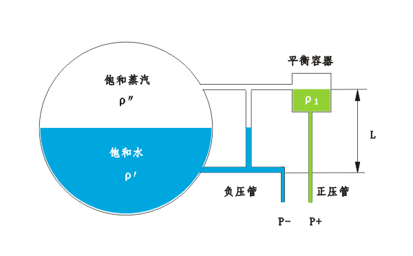 公式中,H为汽包水位高度;ρ1为平衡容器中水的密度;ρ′为汽包饱和水密度、ρ″为汽包内饱和蒸汽的密度;L为汽包上、下连通管间距离。由公式可知,平衡容器结构确定后(即L为已知常数),在汽包压力维持恒定(ρ′、ρ″确定)以及ρ1一定的条件下,正、负导压管的差压输出△P与汽包水位H呈单值函数关系。因此,若P+、P-接差压变送器,就可根据所测出的差压数值知道相应的液位值。