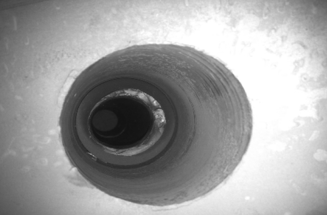 从图2可知,左侧外套管断面内孔呈椭圆形,断口截面各处宽度差别明显,由此可确认左侧外套管运行中内壁受到了长期的单侧磨损,局部管壁由此减薄。此外,断口位于套管变径处,断口以上套管部分与高压内缸测温孔成0.05mm的过盈配合,断口以下部分则有一定间隙,所以形成了所谓“悬臂梁”结构,蒸汽流对伸入高压隔板套内的那段套管表面的冲刷力是不平稳的,在套管变径断口处产生极大的交变应力,再加上此处管壁减薄,最终发生断裂、脱落。随后,内套管在失去外套管的保护后受到高压汽流的冲刷,因为内套管强度远不及外套管,且内套管伸入高压内缸以下的部分同样也是悬臂梁结构,所以内套管也发生折断、脱落。脱落的内外套管残骸落在调节级后的隔板套内,受汽流的冲刷,和周围的高压转子、高压隔板套、高压第1级静叶发生了杂乱无章的撞击,期间撞击右侧外套管,使其头部发生朝调节级动叶方向的弯折,并与调节级动叶发生撞击。左侧外套管内壁长期受到碰磨的主要原因是内、外套管安装不同心。我们可以排除内外缸体的相互移动或者套管、缸体测温孔尺寸不正确等影响因素,剩余最有可能的原因是内外缸测温孔在基建加工时就存在不同心,这可能与测温孔中心定位方法和钻孔的准确度不够有关。