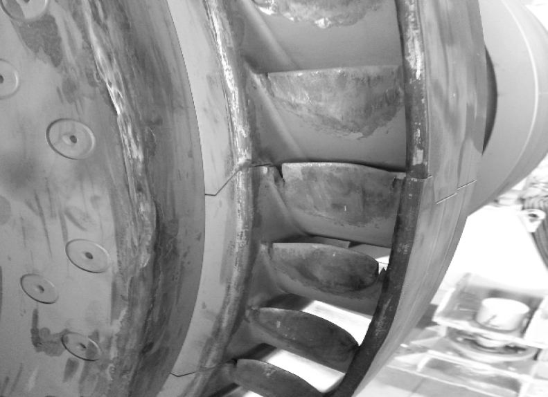 检查还发现所有调节级动叶片出汽边均发生严重变形,如图4所示。每片叶片的出汽边背弧面向内凹陷变形严重,叶片的叶顶、叶根处甚至出现了开裂,背弧面的出汽边均有刮擦的痕迹。从调节级蒸汽热电偶套管的位置来看,右侧套管发生弯折后很有可能撞击调节级动叶,且在转子顺时针旋转时,连续撞击叶片从而导致如此变形。