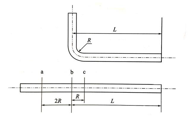 用手工弯管器弯钢管时,先在钢管需要弯曲处划上记号,然后把弯管器套在被弯制的钢管上,弯管器要分别放在被弯制钢管的两侧,如图3所示。弯管时需要两个人共同操作,其中一个人使用2号弯管器,作用是固定被弯管,另一个人使用1号弯管器,由其来进行弯管,两人的用力方向正好相反,如图3中的箭头所示。弯制质量取决于操作1号弯管器的人,如要弯制图3所示的直角弯时,2号弯管器固定在c处不动,1号弯管器从a处用力向箭头方向弯动,并逐渐向b端移动,直至弯成直角弯,这样还可保证L的尺寸。钢管弯制时要一次弯成,管子弯曲后,应检查有无裂纹和凹陷处。仪表管的弯曲半径在《GB 50093-2013 自动化仪表工程施工及验收规范》有规定,即“高压钢管的弯曲半径宜大于管子外径的5倍,其他金属管的弯曲半径宜大于管子外径的3.5倍,塑料管的弯曲半径宜大于管子外径的4.5倍”。