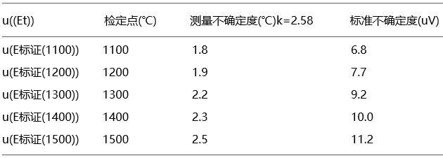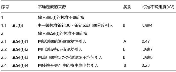 输入量E标证(t)的标准不确定度来源于分度一等标准铂铑30-铂铑6热电偶,分度结果的不确定度,由相关资料可知,换算成热电势值见表4: