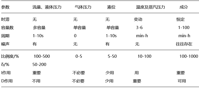 常见控制系统的过程特点及调节器参数范围