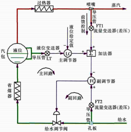 汽包液位作为主变量,对于任何扰动引起的液位变化都会使主调节器LC输出信号发生变化;给水流量是副变量,副变量的引入使副调节器FC在液位还未发生变化时就可根据蒸汽流量的前馈信号消除内扰,使调节过程稳定,起到稳定给水流量的作用;蒸汽流量作为前馈信号引入,用于防止由于虚假液位而使副调节器发出错误的动作,改善蒸汽流量扰动时的调节质量,保证给水流量和蒸汽流量平衡,因此副调节器FC起到了粗调作用。同时信号之间有静态配合问题,而系统的静态特性由主调节器决定,故蒸汽流量信号并不要求与给水流量信号相等,主调节器的任务是校正液位,使稳态时液位等于给定值,主调节器起到了细调作用。