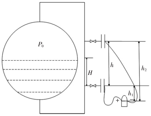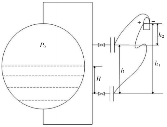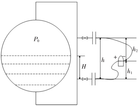 图2中,H为高加内的实际液位;h为高加内的上部法兰和下部法兰之间的距离;h1为变送器负压侧和高加上部法兰之间的高度;h2 为变送器正压侧和高加下部法兰之间的高度;P0 为设计工况下高加内的压力;ρ水为设计工况下高加内水的密度;ρ介为毛细管内所充介质的密度。