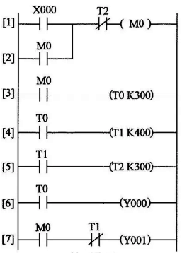 图6 一种典型的多定时器组合控制的PLC线路与梯形图