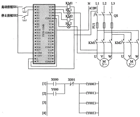 图1 采用线圈驱动指令实现起动、自锁和停止控制的PLC线路与梯形图