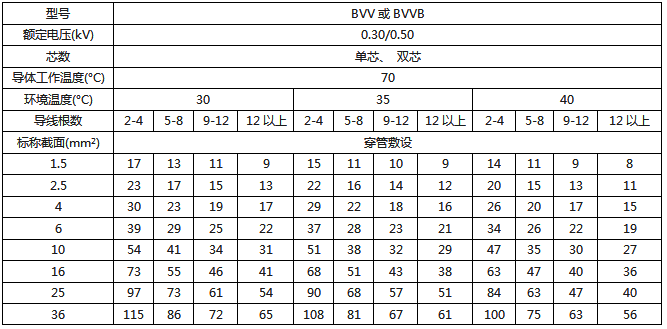 BVV、BVVB绝缘电线穿管暗敷时持续载流量