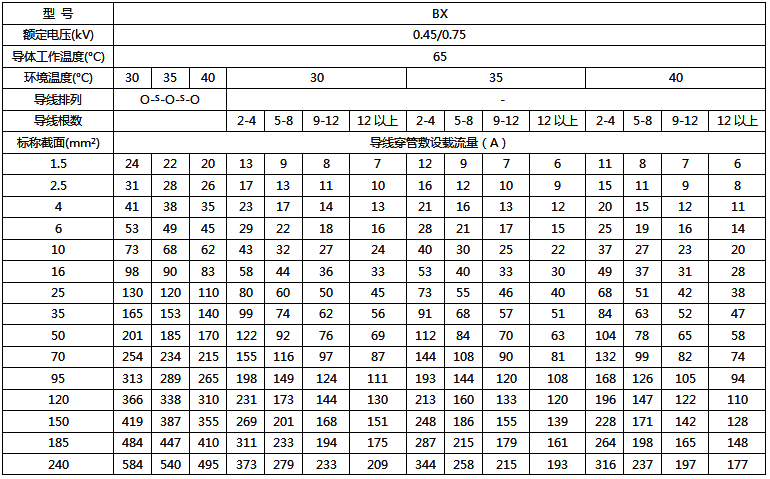 BX绝缘电线明敷及穿管时时持续载流量