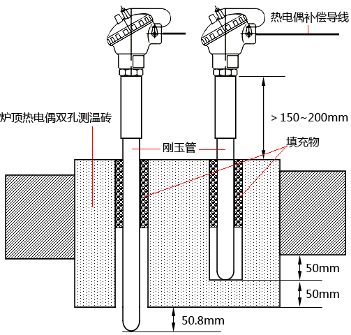 同时插入热电偶的孔与热电偶刚玉管之间的空隙,必须要用玻璃棉、玻璃纤维等填充物将此空隙堵严,以防产生“烟囱效应”(Chimney Effect),使火焰从空隙处冲出烧毁热电偶与补偿导线等。