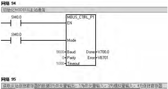 b、在程序调用库文件“MBUS_CTRL,MBUS_MSG”的时候,设置参数应该重点注意通讯速率,仪表地址,仪表读取或写入地址,PLC分配的存储地址。例如作主站的S7-200的MBUS_MSG指令向Modbus从站发送请求消息,和处理从站返回的响应消息。要读取从站的I0.0开始的地址区时,它的输入参数Addr(Modbus地址)为10001。S7-200从站保持寄存器的V区起始地址为VB200时,要读取从站VW200开始的V存储区时,保持寄存器的地址是40001。