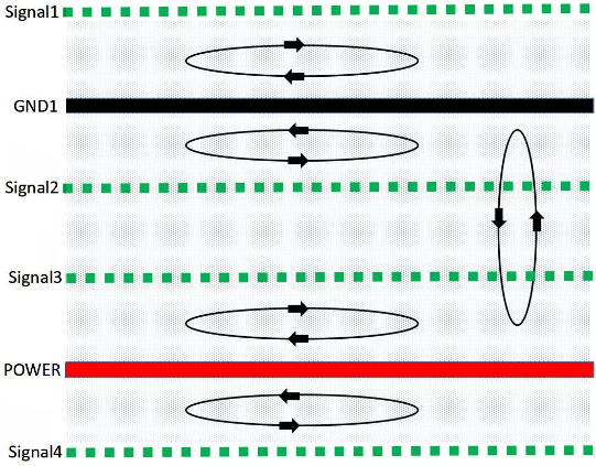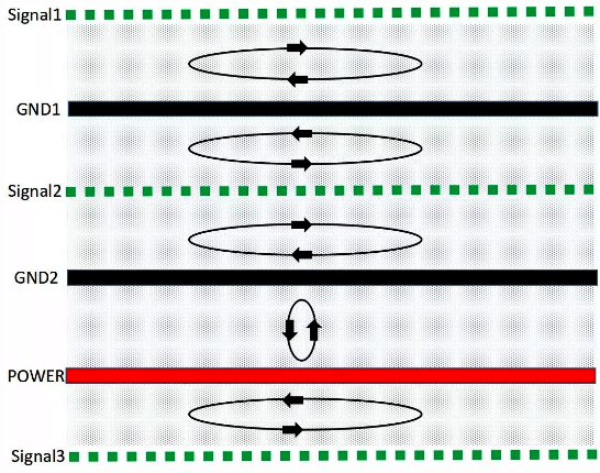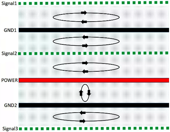 磁通对消的本质就是信号回流路径的控制,具体示意图如下: