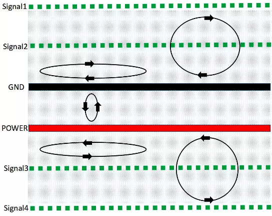 PCB叠层EMC规划与设计思路的核心就是合理规划信号回流路径,尽可能减小信号从单板镜像层的回流面积,使得磁通对消或最小化。