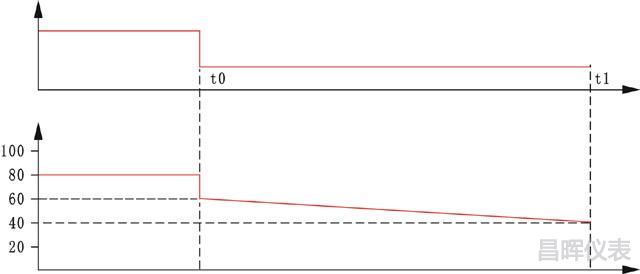 2、有一电动调节器,其参数整定为P(比例度)=50%,I(积分时间)=1分,D=0,测量与给定分别为60%,输出为80%,调节器正作用,在t0时,测量信号瞬时从60%降到50%,1分钟后,仪表输出值变化为多少?请画出输出变化曲线