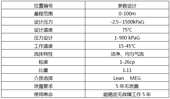 在海上平台投入式液位变送器的设计过程中,最为重要的一项设计因素就是对其设计中的参数设计做出专门的分析,这是保障海上平台投入式液位变送器应用的重要性前提。本文在研究中,以桩腿MEG液位变送器为例对其应用中的参数做出了专门的设计。具体的参数设计如表1所示: