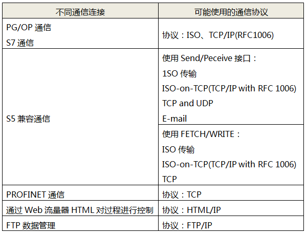 西门子PLC的以太网通讯可使用PG/OP通信、S7通信、S5兼容通信、PROFINTET通信、通过Web流量器HTML对过程进行控制和FTP数据管理等通讯连接,不同通讯连接会用到不同通信协议,不同通讯方式在PLC里面需要调用不同的功能块。fkswng仪表在本文简单介绍西门子PLC以太网通讯不同通信协议及连接特点。