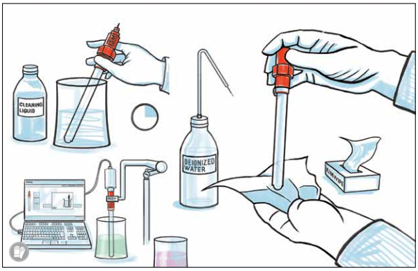 7、洁净之后,使用去离子水冲洗传感器,然后使用Kimwipes低尘擦拭纸或类似物品轻轻拍干(请勿擦拭pH传感器,否则会产生静电,影响测量结果)。