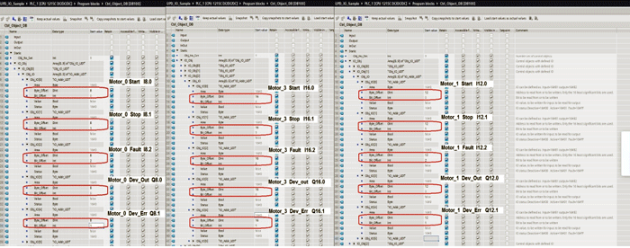 图15为硬件IO可定义MCC控制功能块在OB1的调用,我们可以通过变量修改的方式修改DB100中IO_Obj数组变量关联的硬件IO点,示例中激活了3个控制对象关联的硬件IO点,分别位于S7-1200不同的IO扩展模块上,地址定义如图16-18所示: