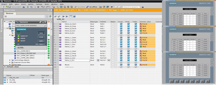 我们引入控制对象的概念,示例中每一个电机就是一个控制对象,每个电机控制对象包括了4个位输入,2个位输出,1个背景数据块,通过控制对象硬件IO表(UDT)将每个控制对象的硬件IO关联到一起。可以有以下两种定义方式: