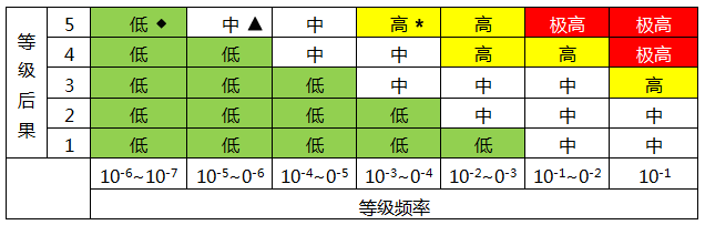 风险评估矩阵扮演重要角色,是风险评估和决策的依据。纵坐标是后果严重性等级,横坐标是事件发生频率。下一章节会展示如何使用这张表格。