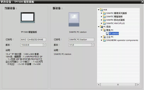 在“HMI_2[TP1500 Comfort]”处右击选择“更改设备/版本”,弹出以下对话框: