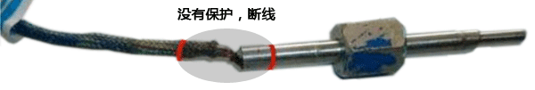 测温导线耐油、耐腐蚀、耐热性能比较差;长期在油浸的环境中,容易出现变硬、变脆、外皮开裂等现象,缩短其使用寿命;长期振动会导致导线在传感器根部断开见(图1、图2)。经现场检查发现,根部断线的故障几乎占了测温电阻故障总数的50%。