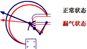 压力元件对任何非温度变化而引起的压力变化的反应,都将转化成气体密度继电器指针动作并反映到刻度盘上,并且可以监测到超出系统允许的最小或最大压力的压力值。如下图漏气情况。