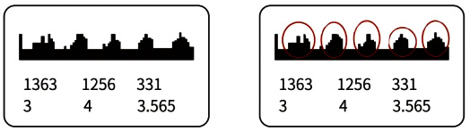 上图中左图是原图,右边是用线圈出来的。线圈里面是一个个间距差不多的,有规律分布的波峰,这个是比较有代表性的变频器造成的电磁干扰。这里基线下面的两行数字都有数值,但是这些数值都是电磁干扰形成,没有任何意义。