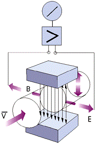 测量流量时,导电性液体以速度V流过垂直于流动方向的磁场,导电性液体的流动感应出一个与平均流速成正比的电压,其感应电压信号通过二个或二个以上与液体直接接触的电极检出,并通过电缆送至转换器通过智能化处理,LCD显示或转换成标准信号4-20mA和0-1kHz。