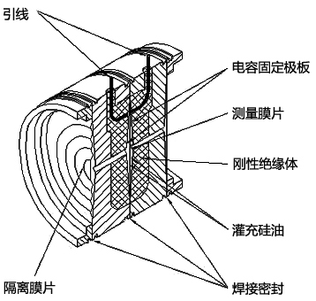 从图2、图3可以看出金属电容式是两边受压,压力经隔离膜片传递到内部中心膜片上。