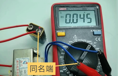 如上图中,初级线圈接触电池时,次级产生的感应电压的正极是红表笔所接的端口,所以电池正极所接的端口与万用表红表笔所接的端口是同名端。